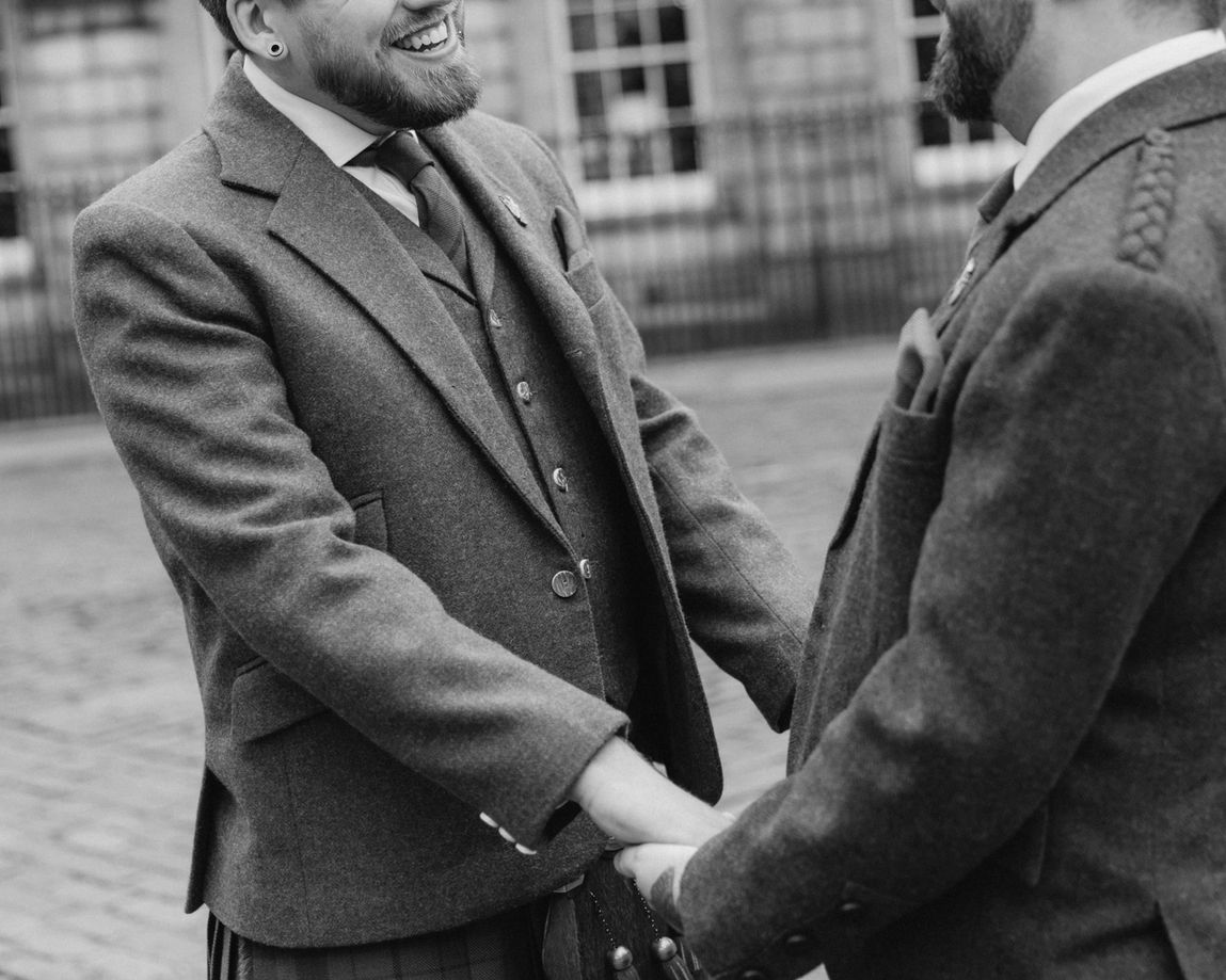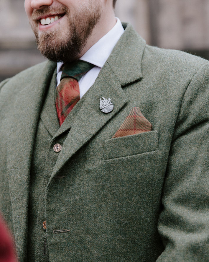 Star Wars was present throughout Jamie and Colin's ceremony but favourite detail had to be their broaches as two mini Millennium Falcons. Non-Star Wars related but a shout out to both our Grooms' suits created by Highland Kilt Connections in an Earthy Green and Red that made both Grooms shine throughout the day.